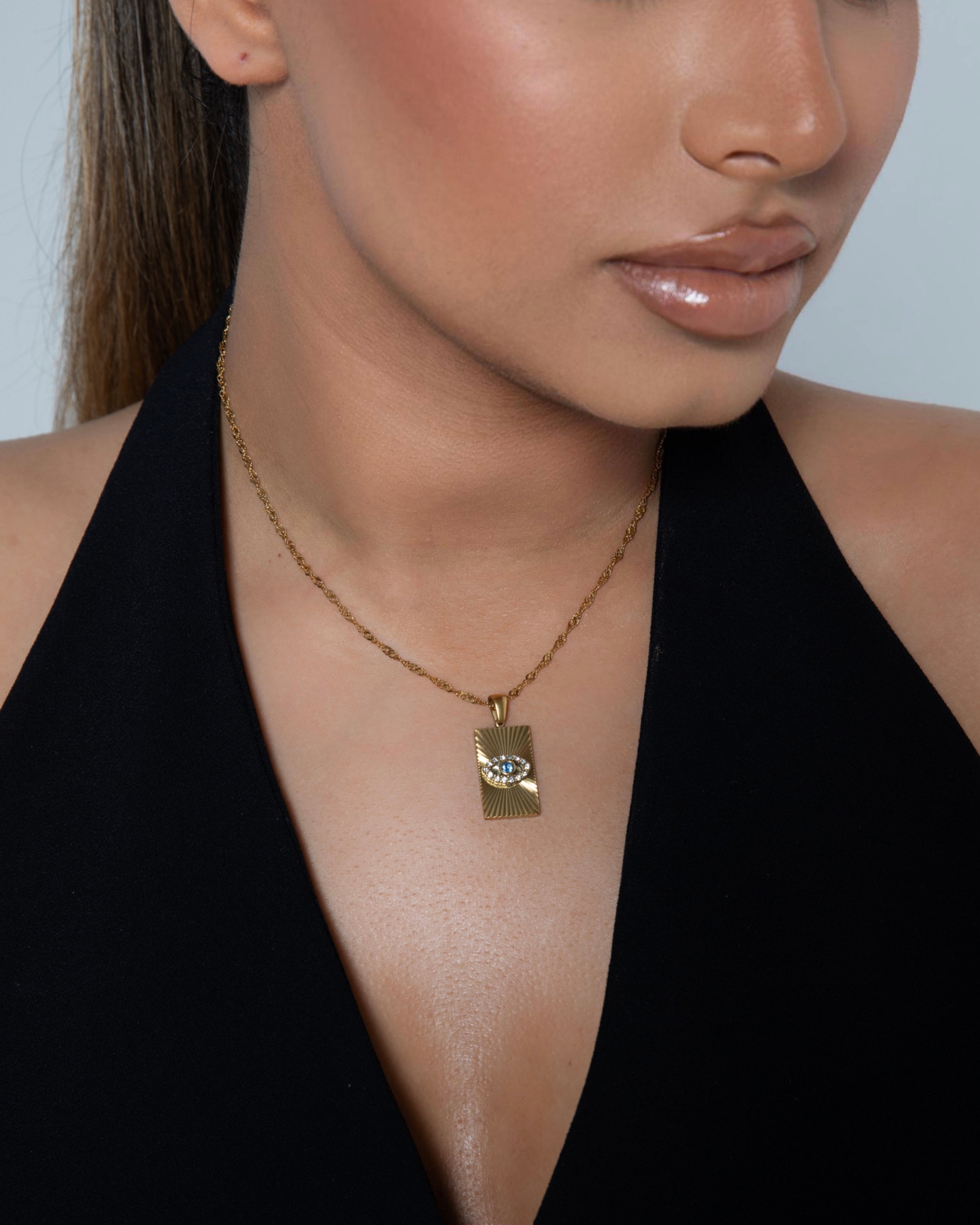 The Sable Necklace is a striking piece that combines contemporary design with meaningful symbolism. Featuring a sleek, rectangular pendant adorned with an eye motif.
