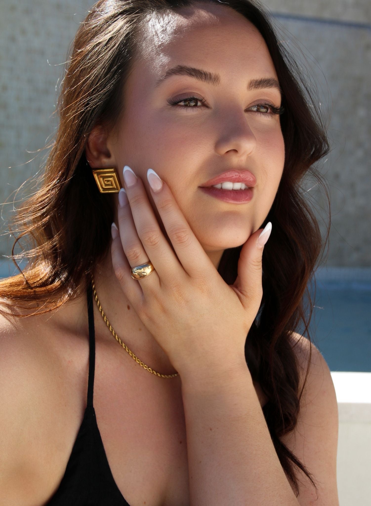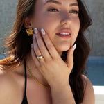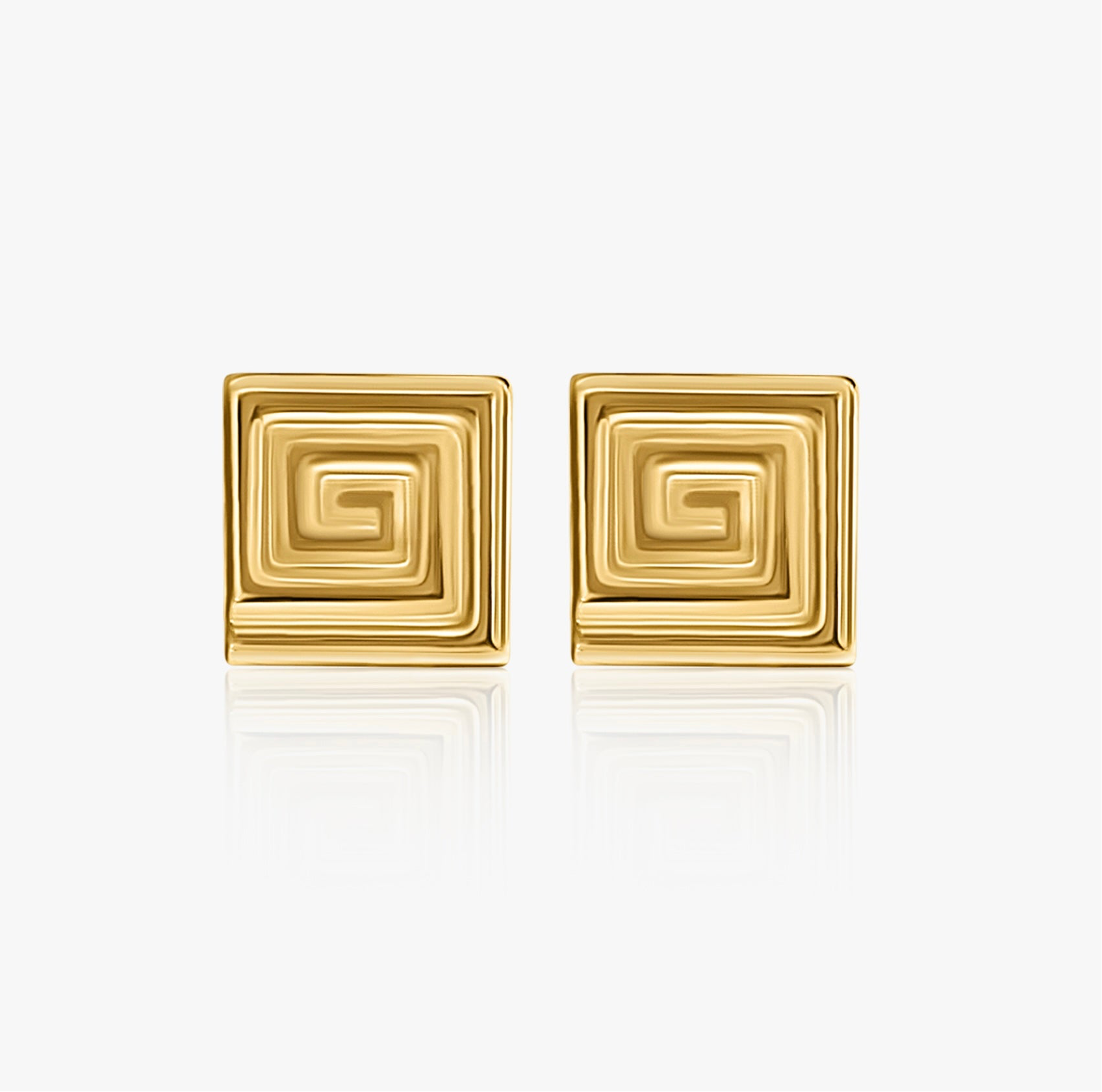 Inspired by ancient Greek motifs, the Athena Square Studs feature a striking geometric design with a bold, structured finish. These earrings are both durable and elegant, Ideal for minimalists and statement lovers alike.