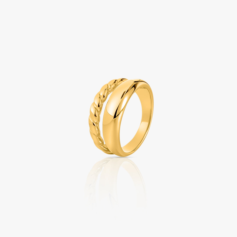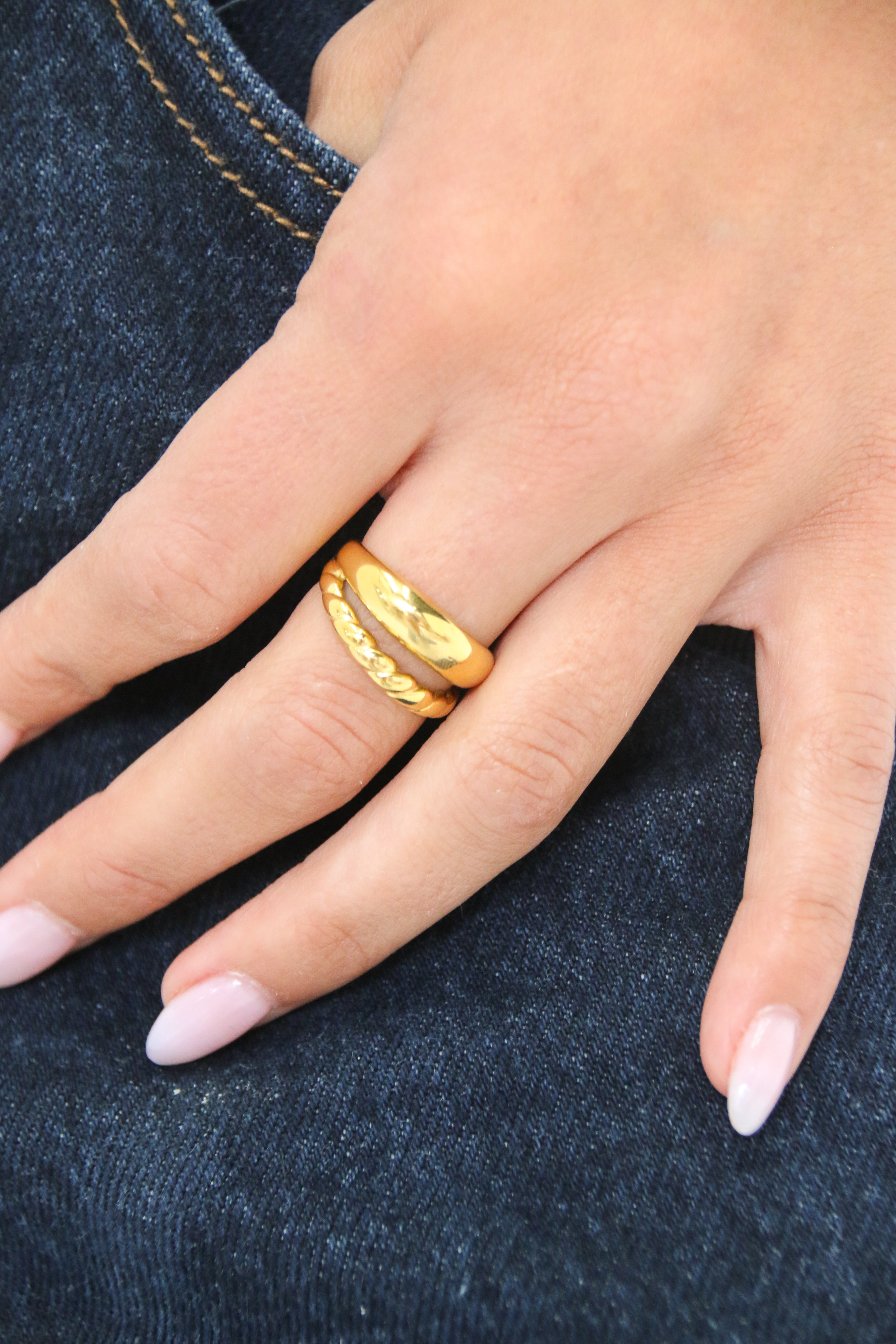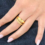 The Solaire Ring is crafted as a single, seamless piece, yet designed to give the look of a stacked set. Its smooth golden curves and subtle detailing create depth and dimension without the need for multiple rings. Bold but wearable, it’s the kind of piece that elevates even the simplest outfit with ease.