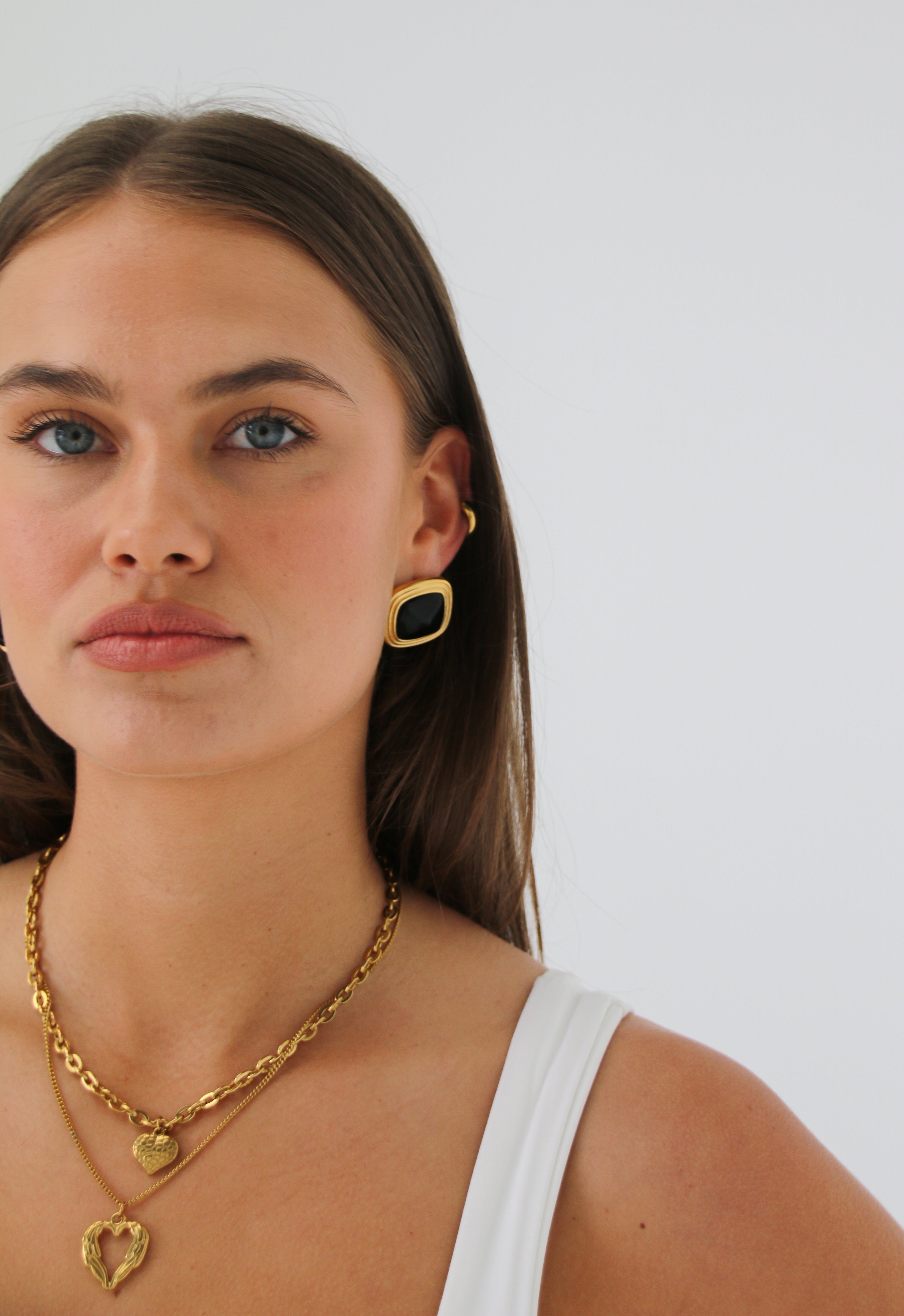 Bold yet timeless, the Noir Aura Studs are designed to turn heads. Featuring a deep black stone framed in soft, golden layers, these earrings strike the perfect balance between elegance and edge. They’re lightweight and comfortable to wear, making them just as fitting for a simple daytime look as they are for a night out.