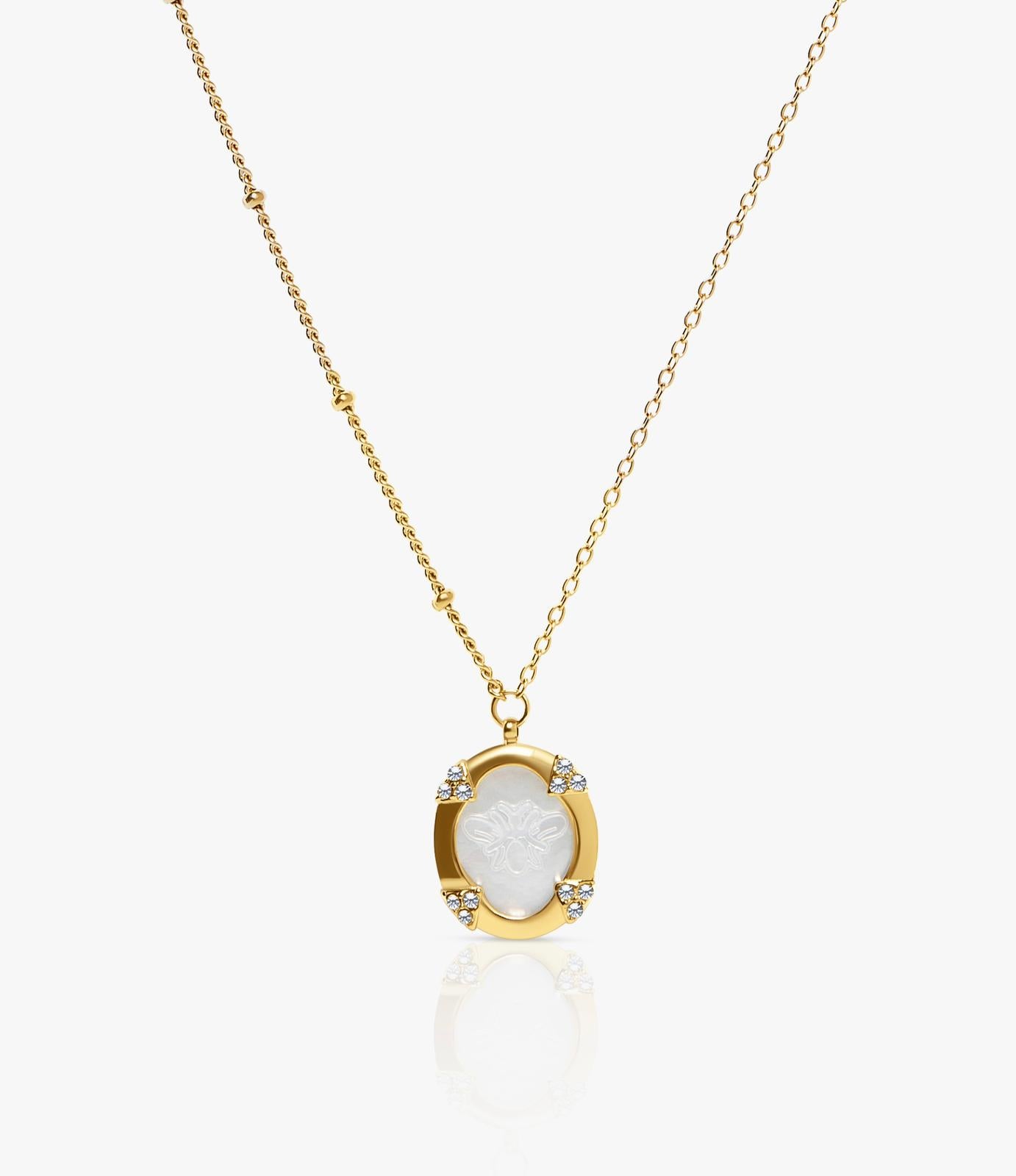 The simple mother-of-pearl Violet Necklace is an elegant piece that highlights natural beauty with effortless charm. Featuring a smooth mother-of-pearl pendant. Its minimalist design makes it ideal for layering or wearing alone, adding a touch of timeless sophistication.